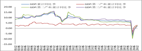中国四季度GDP同比增长6.5%,超过预期的6.2%,较三季度的4.9%明显提速。分产业看,第一产业增加值77754亿元,比上年增长3.0%;第二产业增加值384255亿元,增长2.6%;第三产业增加值553977亿元,增长2.1%,中国国民经济继续呈现稳定恢复增长态势。